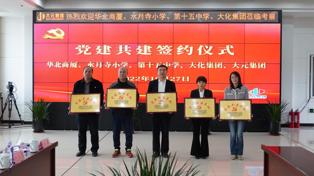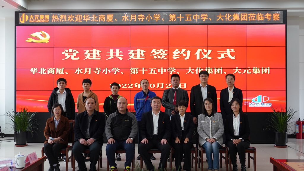 10月27日上午,华北商厦党委书记白美丽、党委委员郭聪、党办室副主任迟立星、办公室副主任李霞、第二党支部副书记张鹏、第四党支部副书记李佳文,沧州市运河区水月寺小学党支部书记、校长文洁,副校长赵俊莲、政教副主任孙宝贞,沧州市第十五中学副校长刘云生、办公室副主任刘远,沧州大化集团党群工作部部长郎宝忠、组织干事张沛元莅临大元集团联合开展“党建互联共建”活动,大元集团党委副书记于宙,总部党支部书记、党群文化中心总监王金英,人力资源管理中心、综合管理中心总监齐平安,元正文旅集团党支部书记苏娜出席本次签约仪式。会议由大元集团总部党支部书记、党群文化中心总监王金英主持。