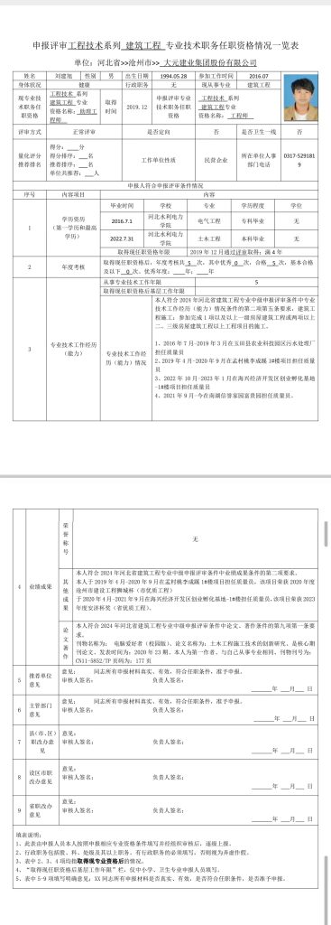 刘健旭申报评审工程技术系列建筑工程专业技术职务任职资格情况一览表
