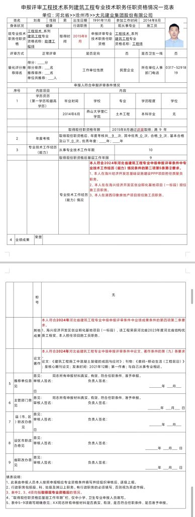 刘青申报评审工程技术系列建筑工程专业技术职务任职资格情况一览表