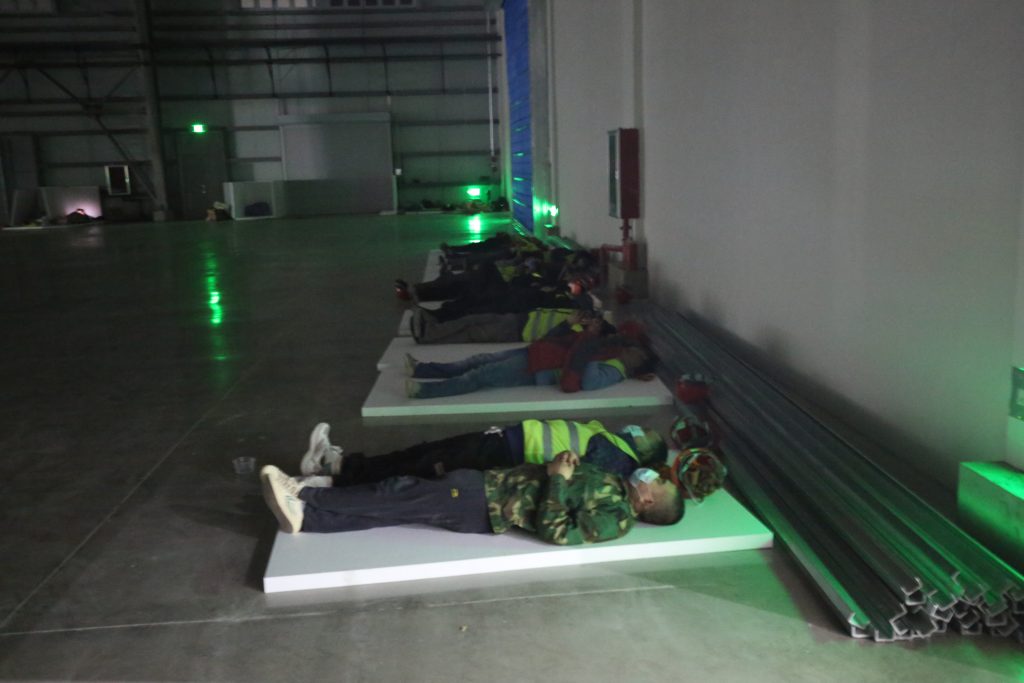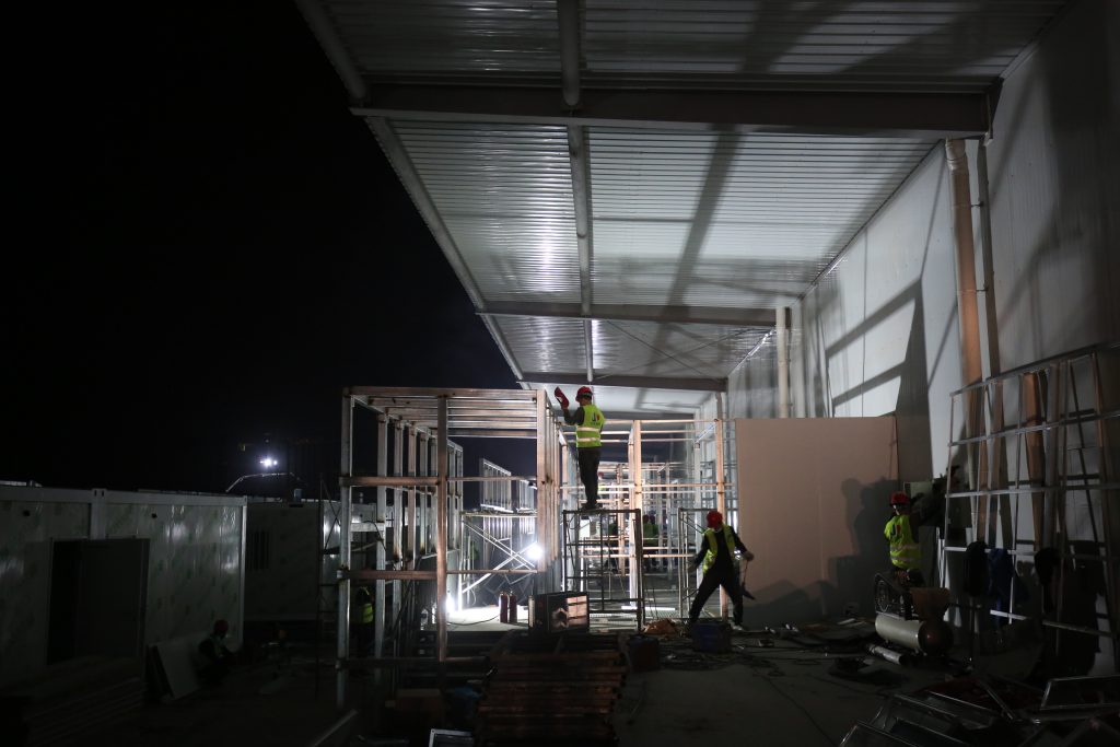 大干快干、争分夺秒。各小组交差施工,同步作业,24小时昼夜鏖战。为顺利交付,施工人员常常席地而睡,用血肉之躯,顽强意志建设“生命之舟”。240个小时,按时交付方舱医院。