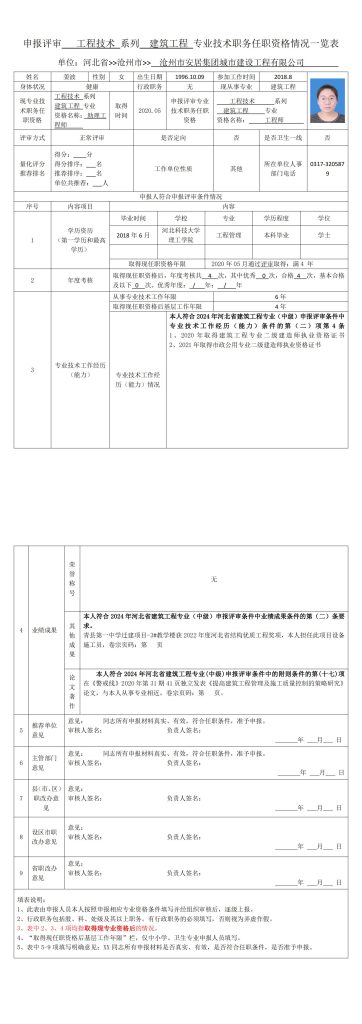 姜波申报评审工程技术系列建筑工程专业技术职务任职资格情况一览表