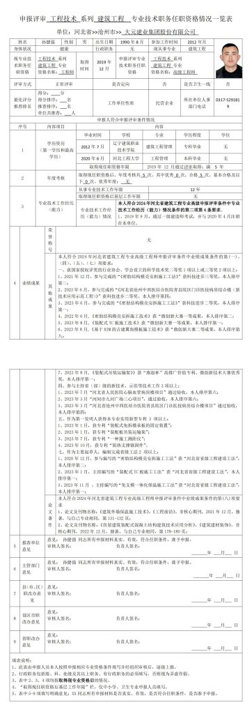 孙健强申报评审工程技术系列建筑工程专业技术职务任职资格情况一览表
