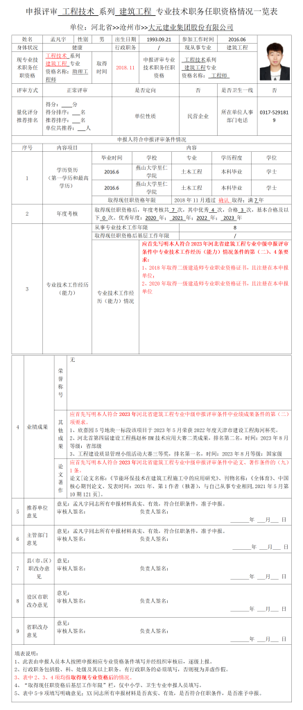 孟凡宇申报评审工程技术系列建筑工程专业技术职务任职资格情况一览表