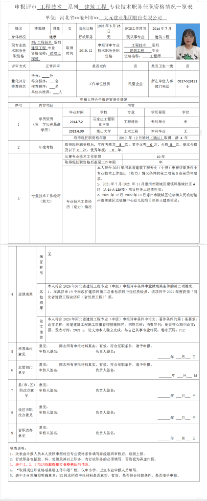 季雅晴申报评审工程技术系列建筑工程专业技术职务任职资格情况一览表