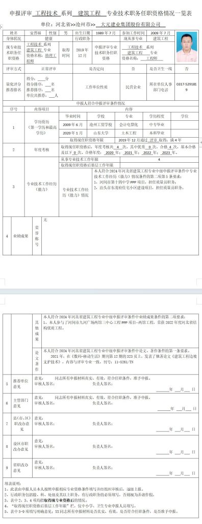安晋福申报评审工程技术系列建筑工程专业技术职务任职资格情况一览表