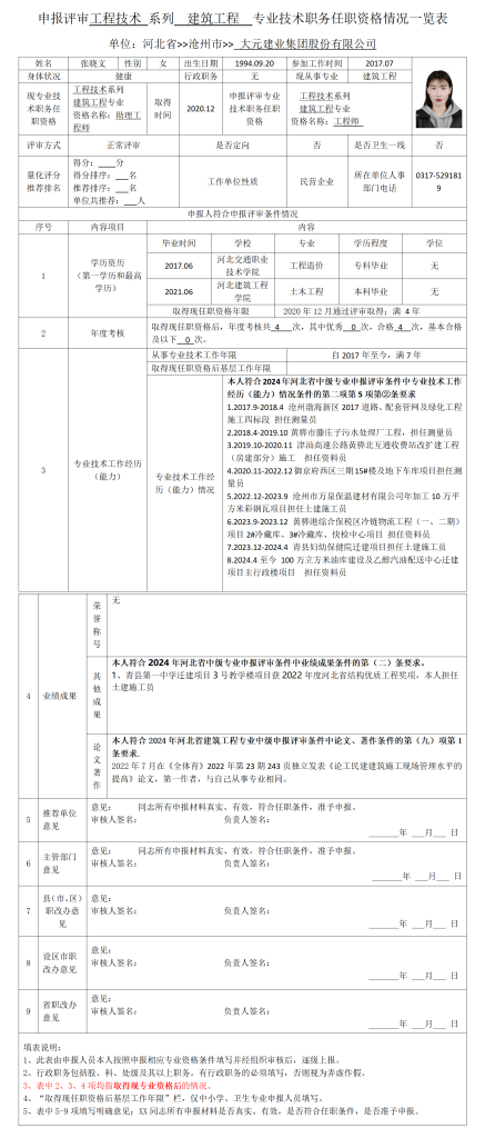 张晓文申报评审工程技术系列建筑工程专业技术职务任职资格情况一览表