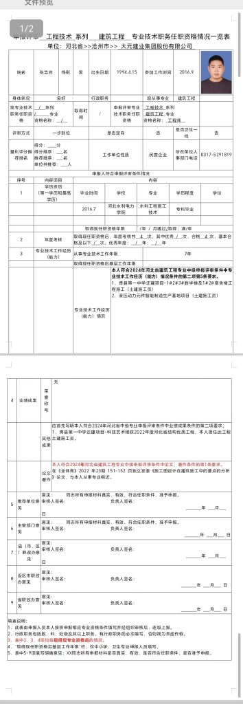 张浩然申报评审工程技术系列建筑工程专业技术职务任职资格情况一览表