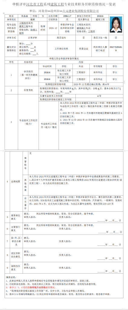 李晶晶申报评审河北省工程系列建筑工程专业技术职务任职资格情况一览表
