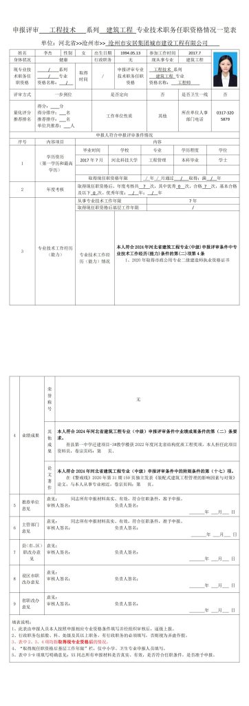 李杰申报评审工程技术系列建筑工程专业技术职务任职资格情况一览表