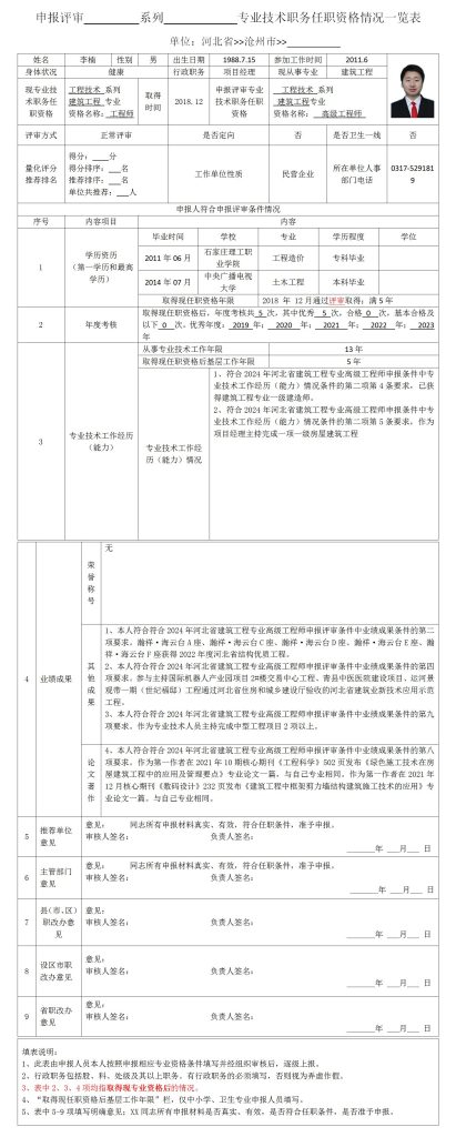 李楠申报评审系列专业技术职务任职资格情况一览表