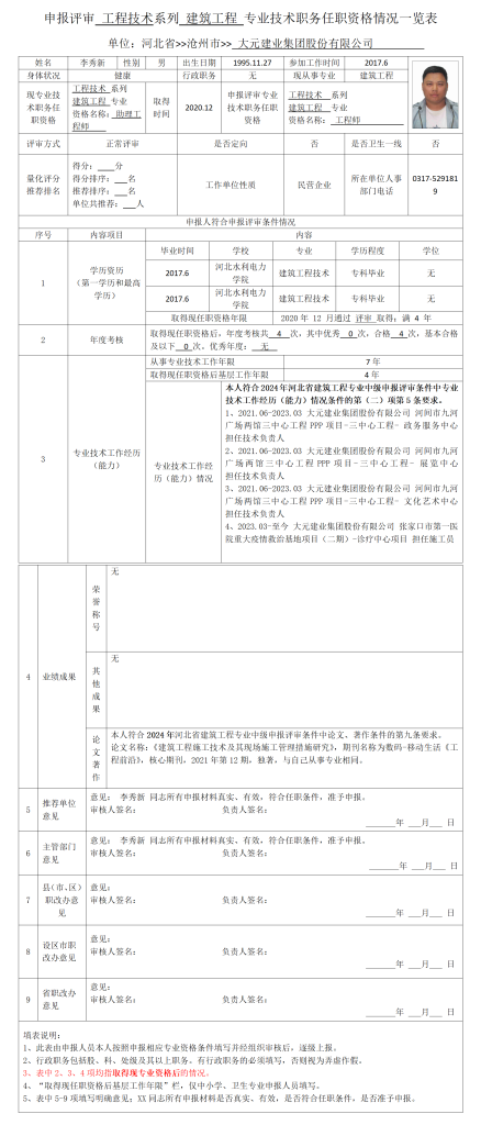 李秀新申报评审工程技术系列建筑工程专业技术职务任职资格情况一览表