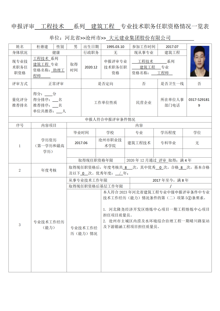 杜德建申报评审工程技术系列建筑工程专业技术职务任职资格情况一览表