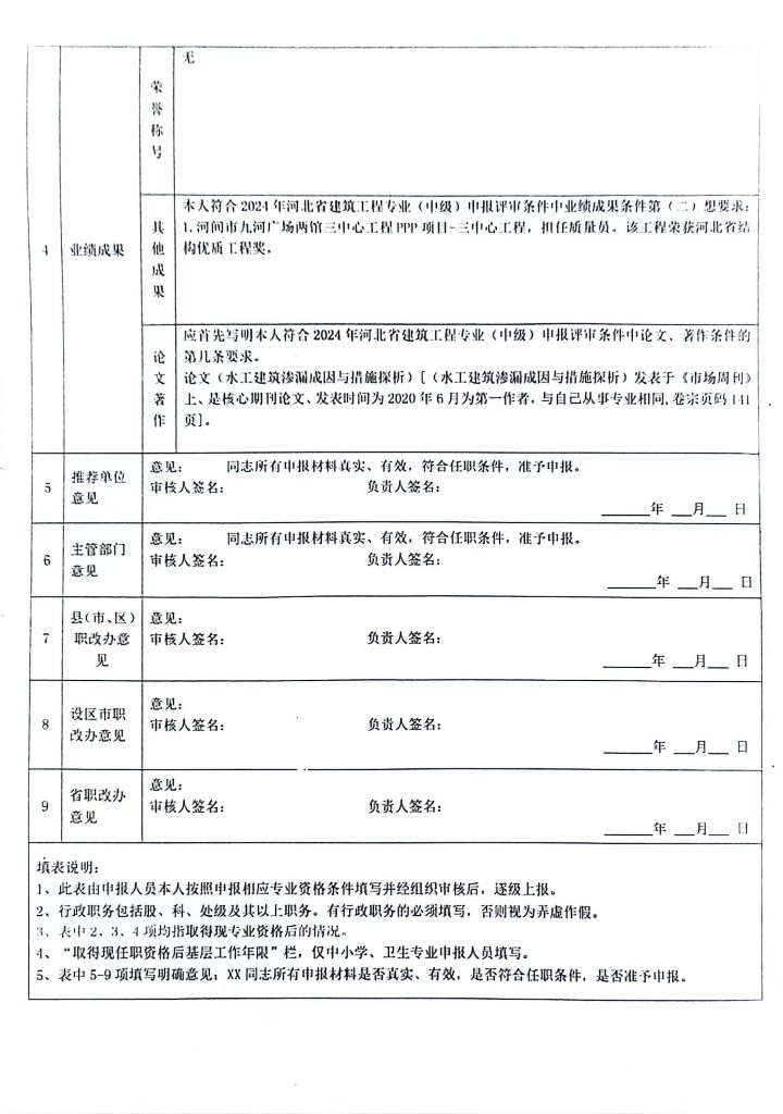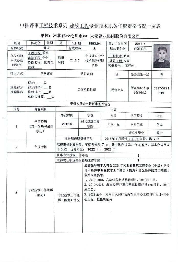 杨茂仓申报评审工程技术系列建筑工程专业技术职务任职资格情况一览表