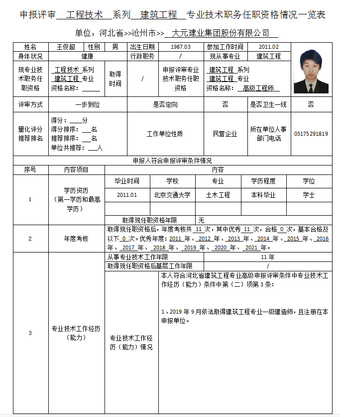 王俊超申报评审工程技术系列建筑工程专业职务任职情况一览表