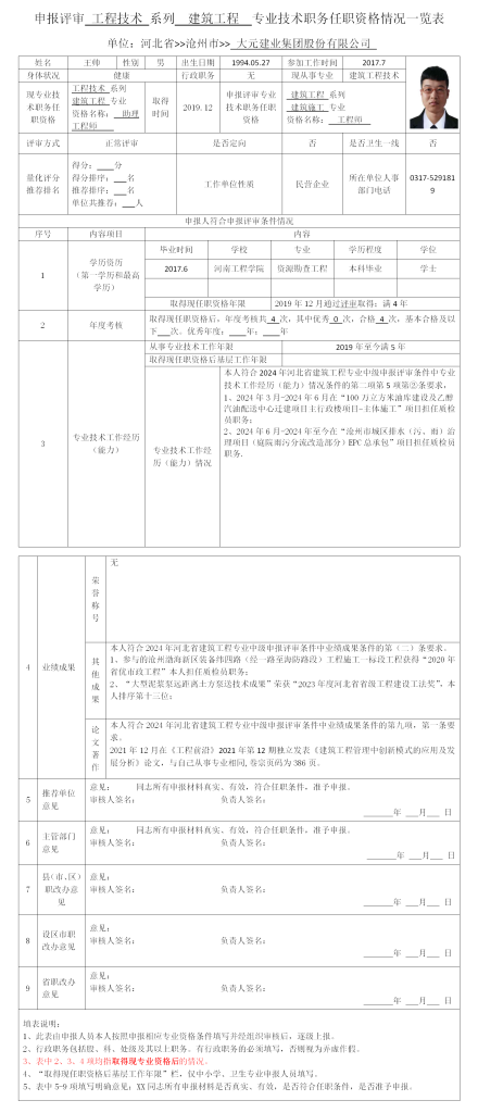 王帅申报评审工程技术系列建筑工程专业技术职务任职资格情况一览表