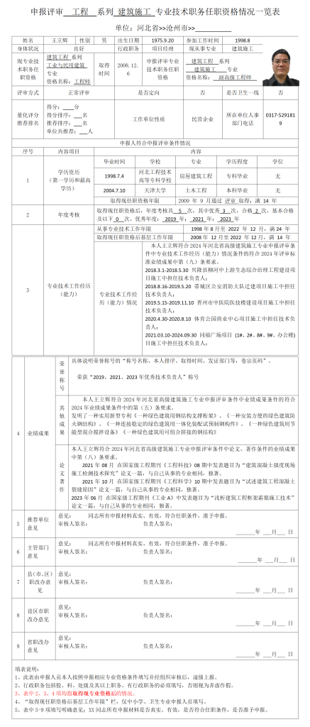 王立辉申报评审工程系列建筑施工专业技术职务任职资格情况一览表