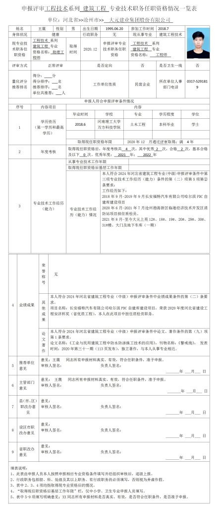 王震申报评审工程技术系列建筑工程专业技术职务任职资格情况一览表