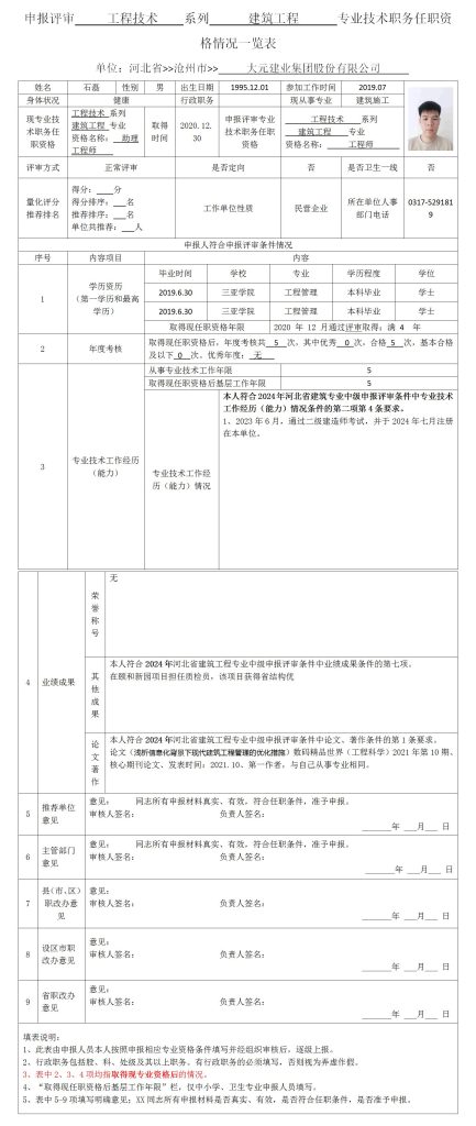 石磊申报评审建筑工程系列建筑工程专业技术职务任职资格情况一览表