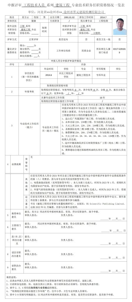 肖方云申报评审工程技术人员系列建筑工程专业技术职务任职资格情况一览表