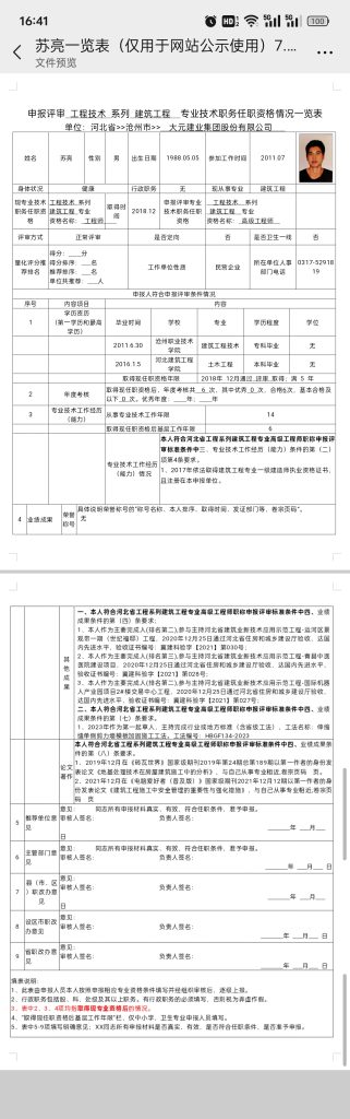 苏亮申报评审工程技术系列建筑工程专业技术职务任职资格情况一览表
