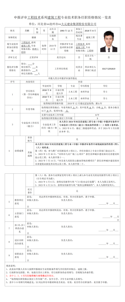 苏鹏申报评审工程技术系列建筑工程专业技术职务任职资格情况一览表
