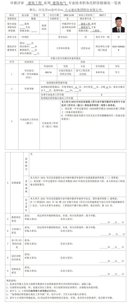 赵元强申报评审建筑工程系列建筑电气专业技术职务任职资格情况一览表