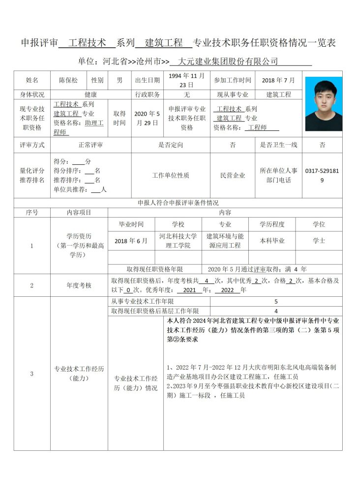 陈保松申报评审工程技术系列建筑工程专业技术职务任职资格情况一览表