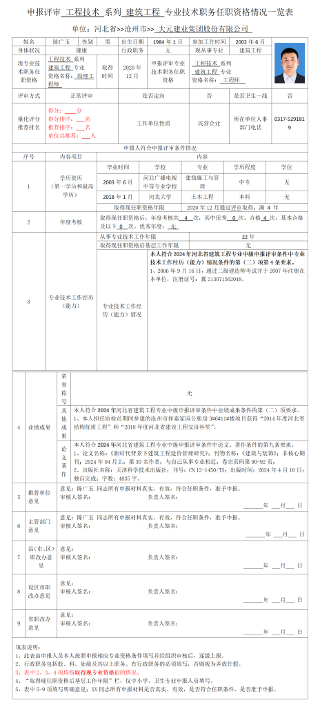 陈广玉申报评审工程技术系列建筑工程专业技术职务任职资格情况一览表