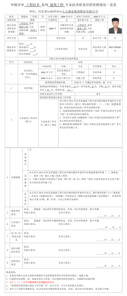黄烁勋申报评审工程技术系列建筑工程专业技术职务任职资格情况一览表